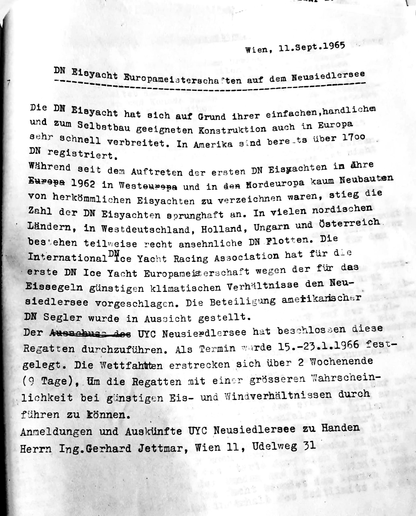 Vienna, September 11, 1965 DN Ice Yacht European Championships on Lake Neusiedl Due to its simple, manageable design, suitable for self-construction, the DN ice yacht has spread very rapidly throughout Europe. In America, over 1,700 DNs are already registered. While since the appearance of the first DN ice yachts in Europe in 1962, there have been hardly any new builds of conventional ice yachts in Western and Northern Europe, the number of DN ice yachts has increased dramatically. In many Nordic countries, as well as in West Germany, the Netherlands, Hungary, and Austria, there are sometimes quite substantial DN fleets. The International Dice DN Ice Yacht Racing Association proposed Lake Neusiedl for the first DN Ice Yacht European Championship due to its favorable climatic conditions for ice sailing. The participation of American DN sailors was anticipated. The committee of the UYC Neusiedlersee decided to hold these regattas. The dates set were January 15-23, 1966. The races will be spread over two weekends (9 days) to increase the likelihood of favorable ice and wind conditions. Registrations and information should be directed to UYC Neusiedlersee, addressed to Mr. Gerhard Jettmar, Vienna II, Udelweg 31